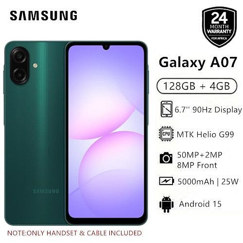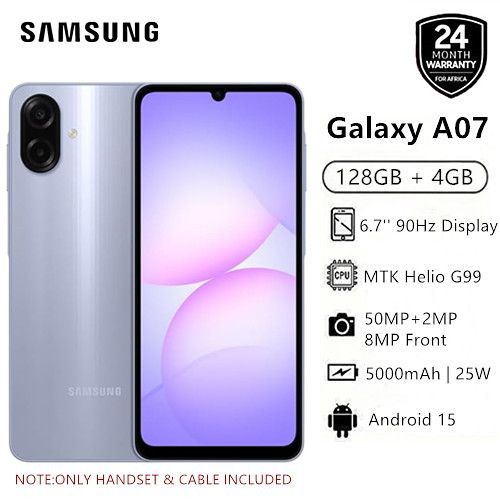 New Arrival Samsung Galaxy A07 128GB+4GB 6.7" 90Hz 50MP Dual Camera MTK Helio G99 5000mAh 25W Type-C Charge Android 15 Smart Phones IP54 Waterproof Side Fingerprint phone